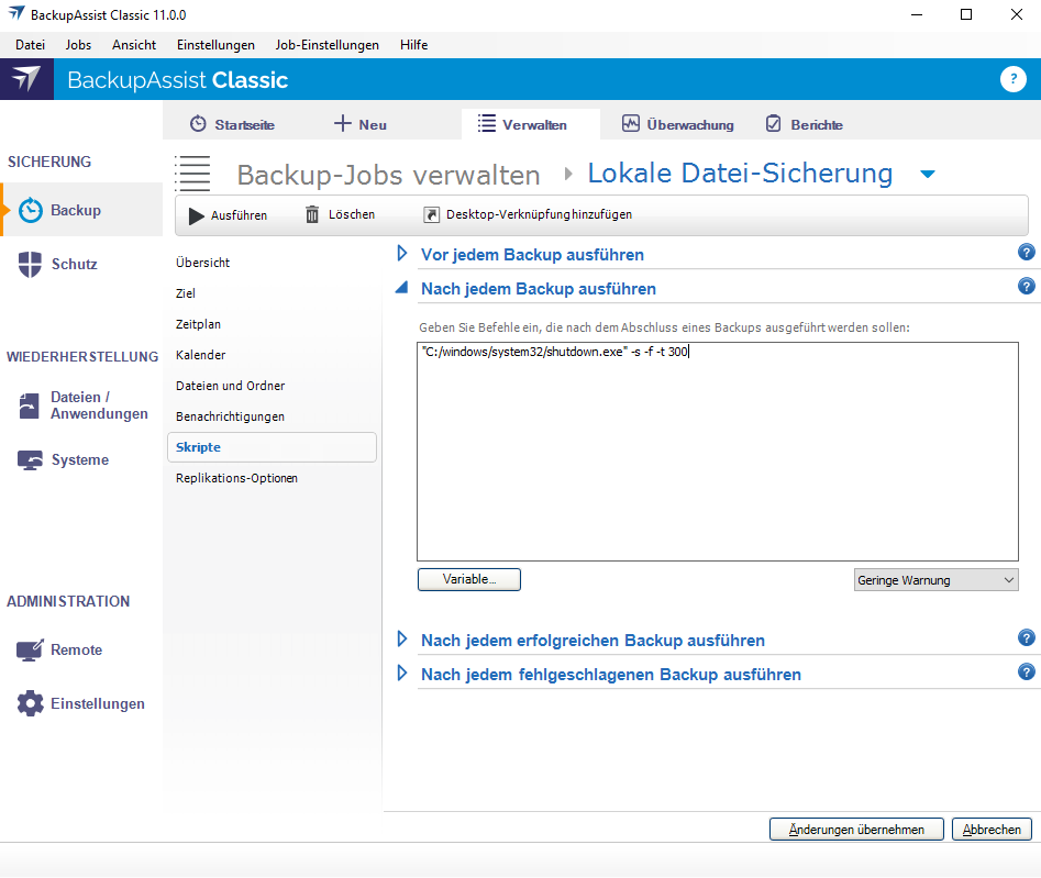 Windows nach dem Backup mit BackupAssist Classic automatisch herunterfahren
