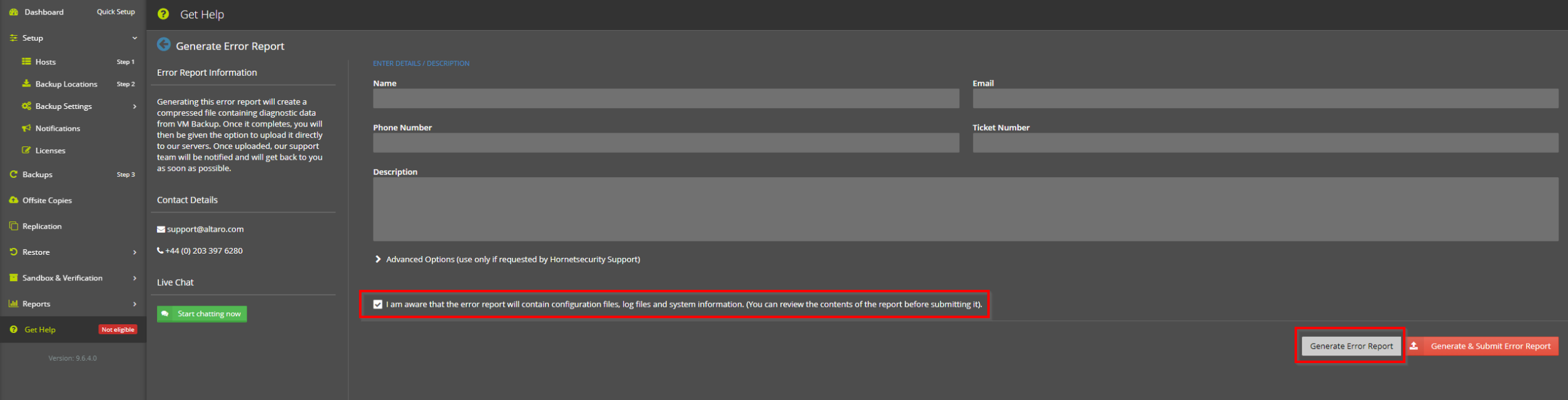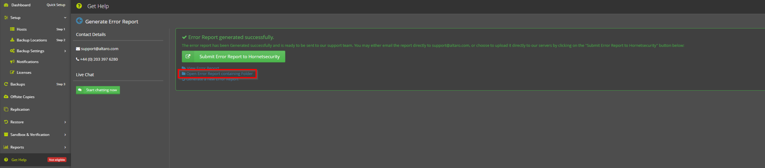 Diagnosedateien und Fehlermeldungen können Sie auch direkt und kostenlos an den Altaro-Support senden. Hier antwortet Ihnen der englischsprachige Support sehr zeitnah. Informationen hierzu sind hier gelistet.