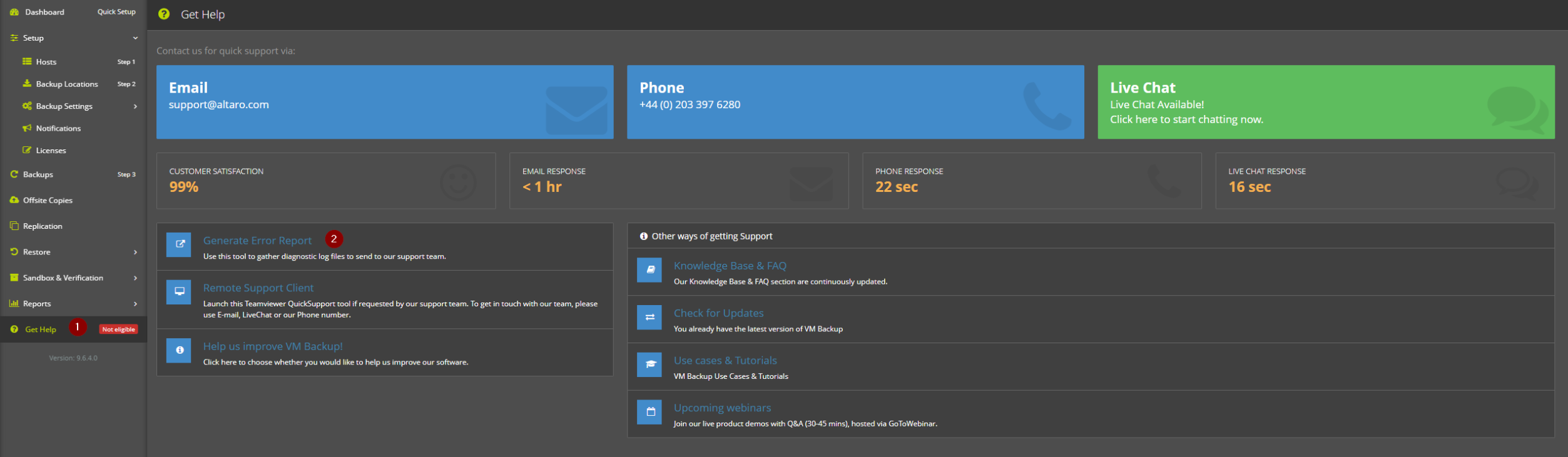 Ein Live-Chat steht Ihnen direkt in der Software zur Verfügung – so können Sie innerhalb weniger Sekunden mit einem Altaro-Techniker kommunizieren.