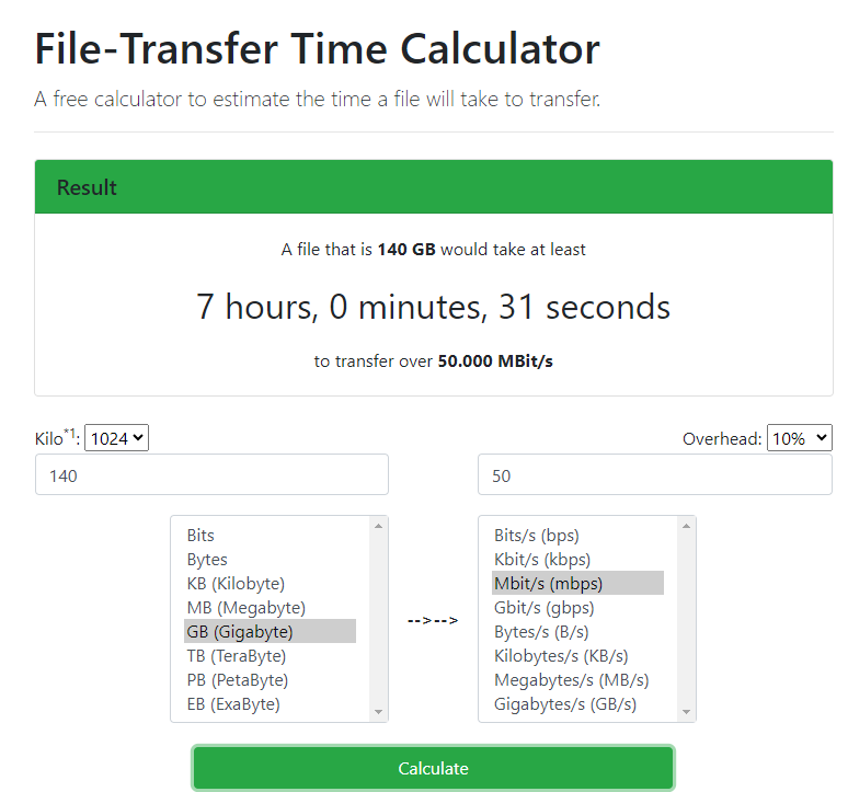 Wenn es zu hohen Datenmengen kommt, ist es für die Analyse praktisch zu wissen, wie lange der Transfer theoretisch dauern wird. Dies kann man schnell mit einem "File Transfer Time Calculator" ausrechnen. Einen browserbasierten und kostenlosen Rechner finden Sie hier. Geben Sie die Datenmenge an und unten die ungefähre Transferrate und klicken Sie auf "Calculate". Im Feld "Result" wird Ihnen nun angezeigt, wie lange der Transfer bei konstantem Datenfluss dauern würde.
