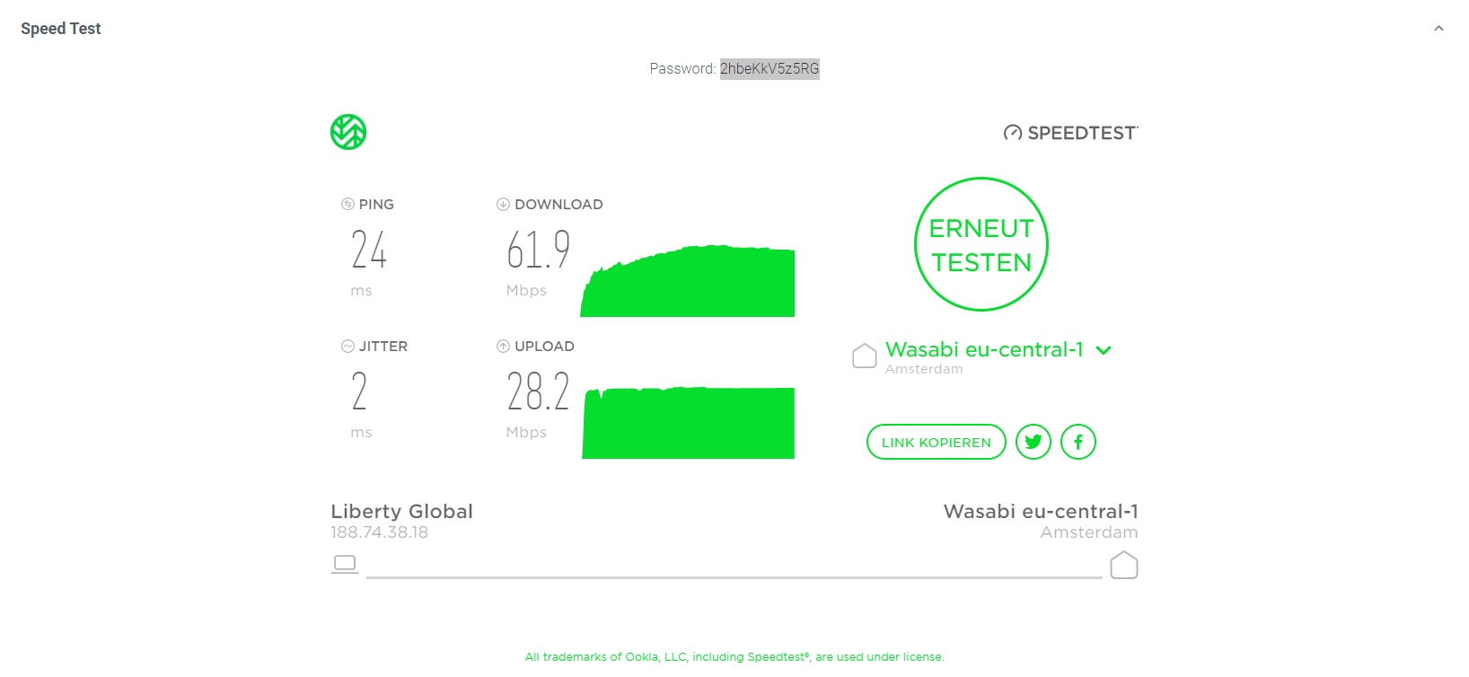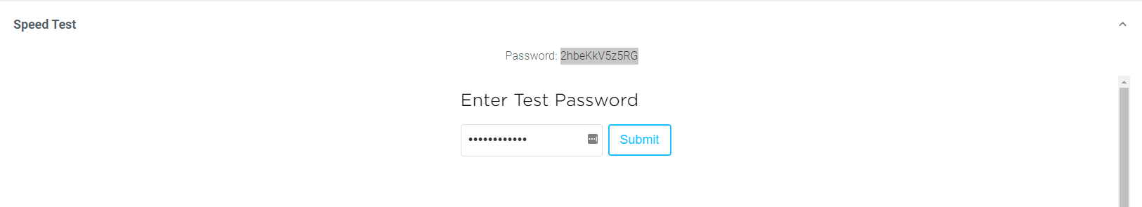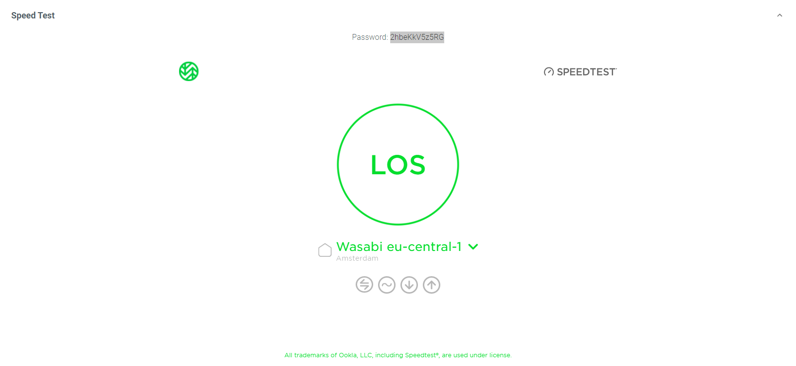 Um den in EL storage eingebundenen Speedtest zu nutzen, navigieren Sie in Ihrer Wasabi-Konsole zu Einstellungen → Geschwindigkeitstest. Kopieren Sie das oben angegebene Passwort und geben es im unteren Feld ein.