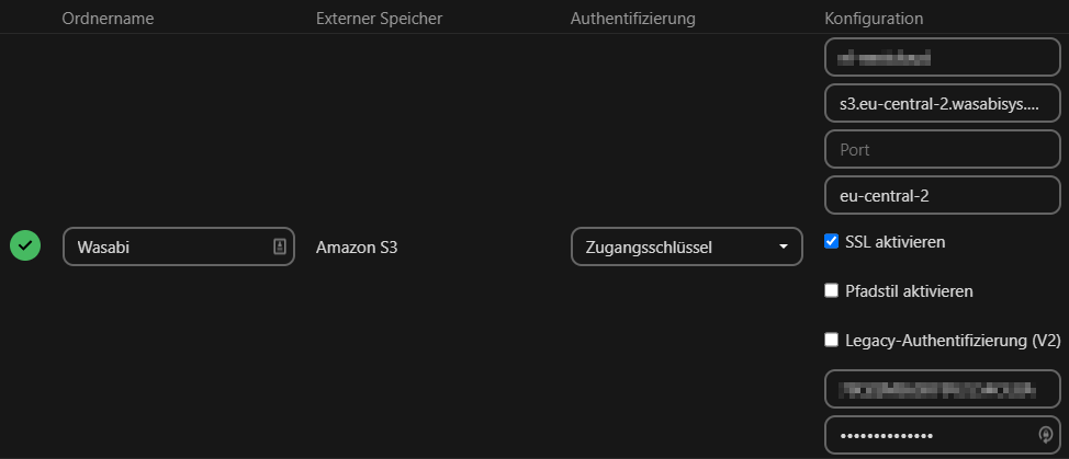 Geben Sie einen beliebigen Ordnernamen an. Als externen Speicher wählen Sie "Amazon S3" aus und als Authentifizierung "Zugangsschlüssel".