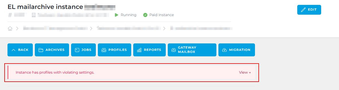 The instance contains archiving profiles with unauthorized settings. Such instances are initially provided with a warning and automatically restarted in safe mode after 72 hours. In safe mode